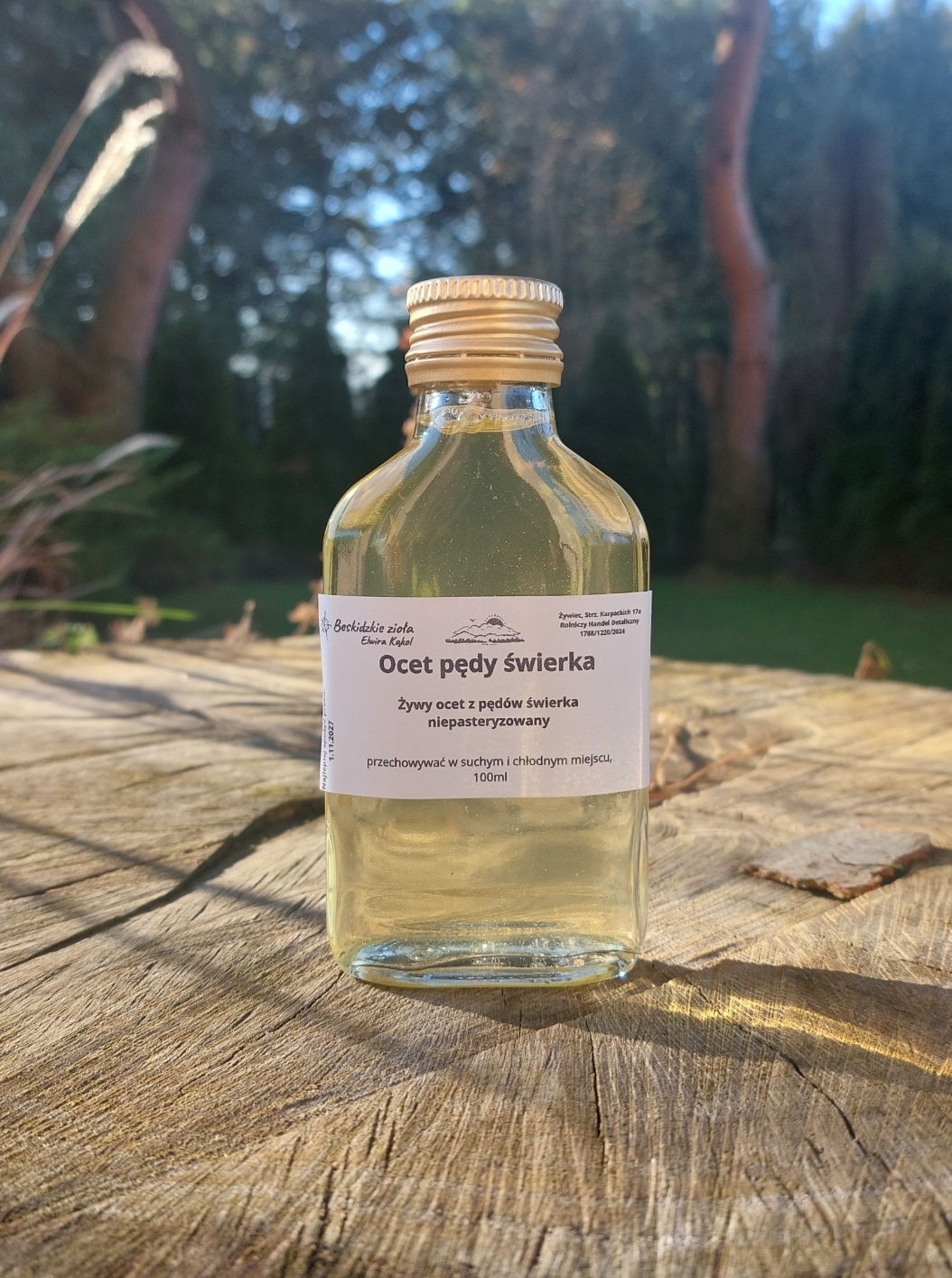 Ocet o wyjątkowym aromacie świerkowego igliwia to doskonały dodatek do drinka z miodem, do sałatek, past kanapkowych, do zup. Może być także używany do marynaty do mięs oraz ryb.