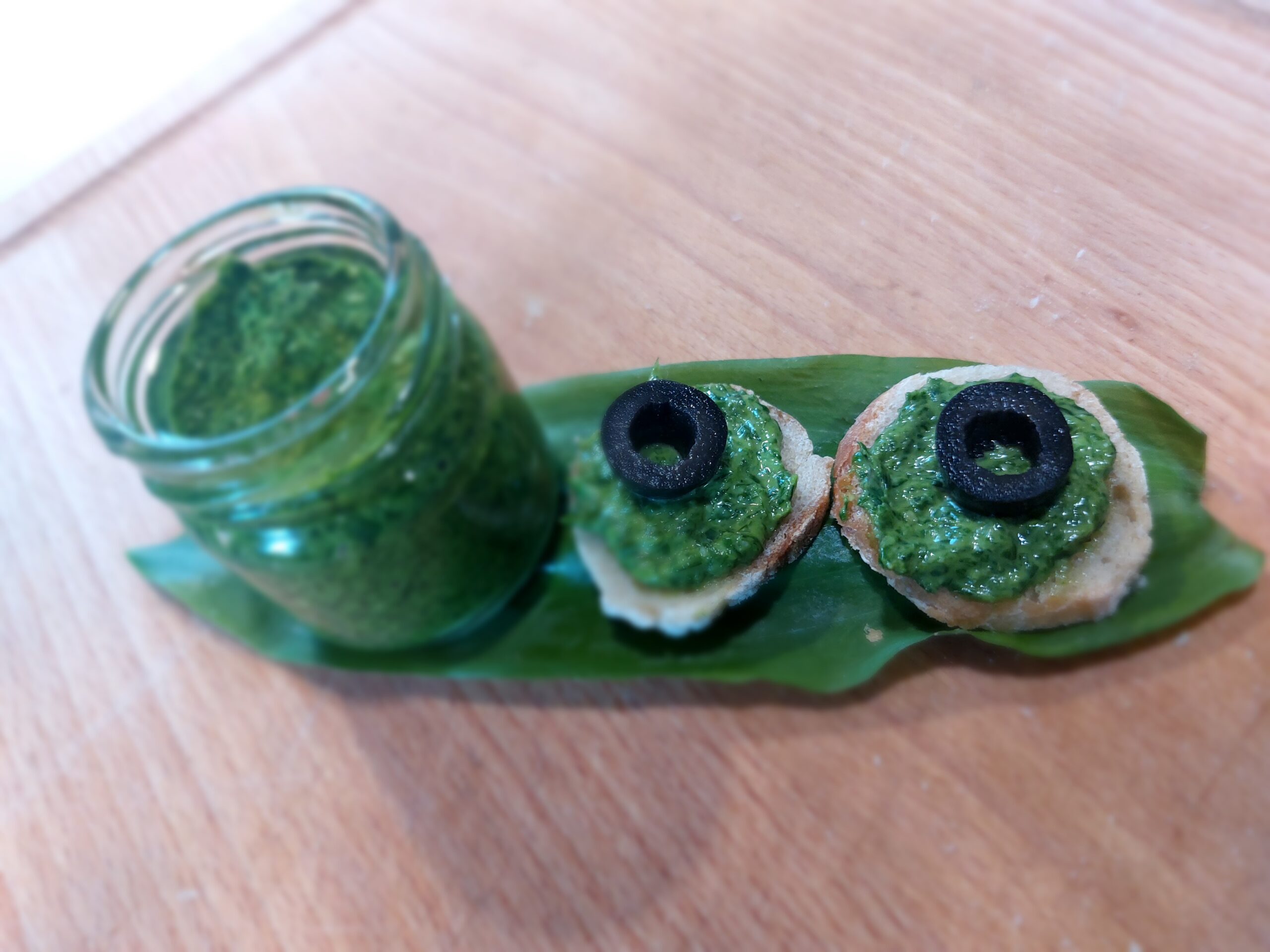 Pesto z czosnku niedźwiedziego, zblendowane z ziarnem słonecznika, olejem słonecznikowym i solą kłodawską.